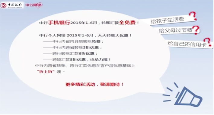 1、2015年1-6月,通过中行手机银行进行中行内省内异地转账、中行内跨省转账和跨行汇款,手续费全免!