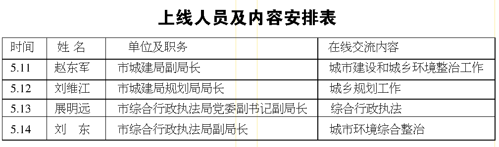 5月11日—5月14日城市建设与管理专题周,每天上午8:50—9:30,市城建局和综合行政执法局领导做客莱西人民广播电台“政风行风在线”栏目,与听众进行在线交流,受理、答复群众投诉。