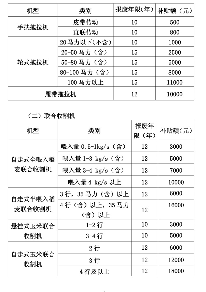 答:农机报废更新补贴额按报废拖拉机、联合收割机的机型和类别确定,具体补贴标准如下表: