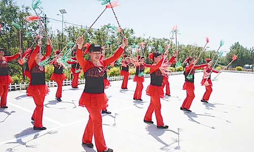 5月31日,店埠镇花棍舞爱好者在店埠镇博物馆门前进行花棍舞表演,表达她们对休闲体育大会即将召开的喜悦之情。