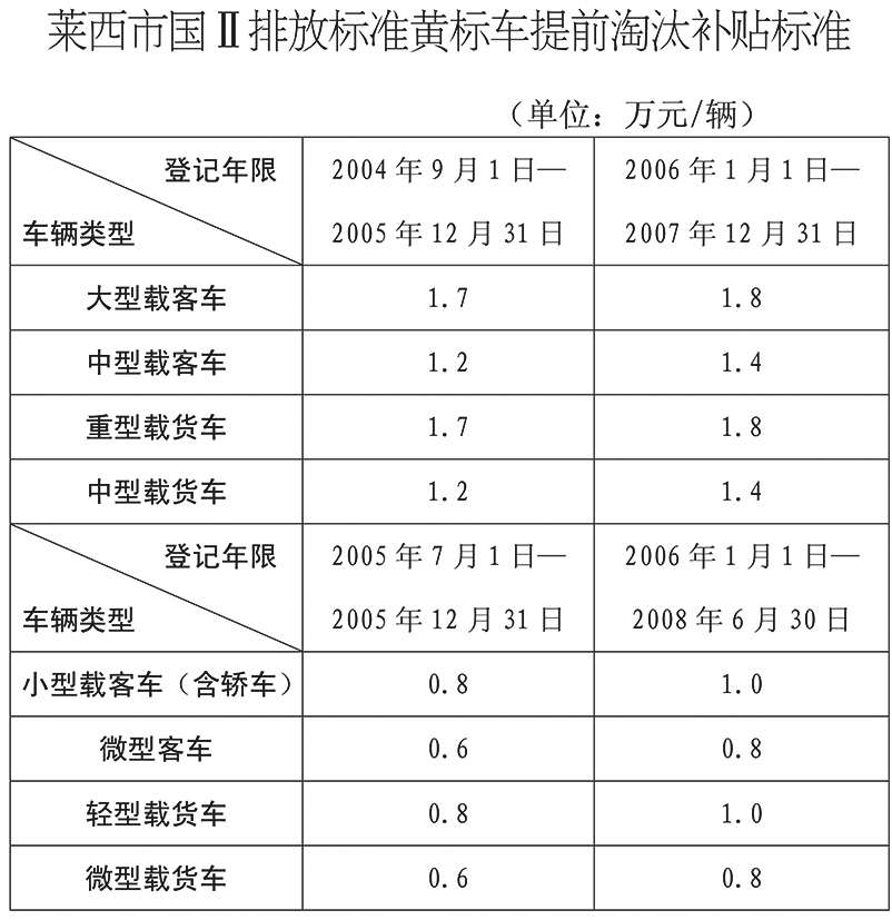 为鼓励广大车主积极提前淘汰黄标车,我市2015年7月份出台了《莱西市国Ⅱ排放标准黄标车提前淘汰资金补助政策》,具体补贴标准如下: