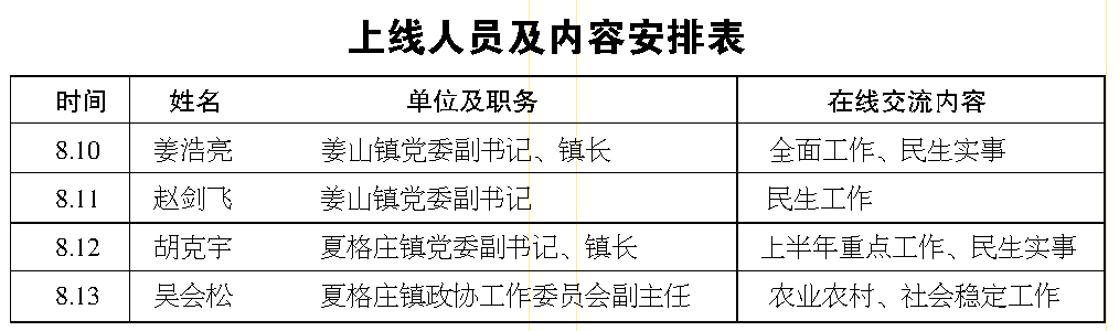 8月10日—8月13日镇、街道专题周,每天上午8:50—9:30,姜山镇和夏格庄镇的领导做客莱西人民广播电台“政风行风在线”栏目,与听众进行在线交流,受理、答复群众投诉。