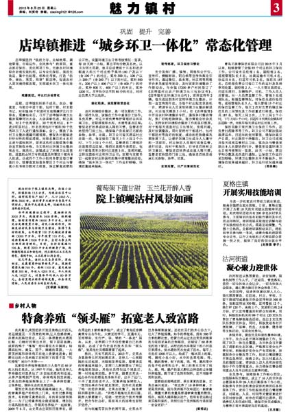 今年环境整治过程中,浆砌排水沟3000多米,栽植苗木1400余株,粉刷墙壁、绘制宣传图画18000多平方米。该村充分发挥党员干部、村民小组的作用,积极发动村民参与环境卫生整治,取得了良好的效果。去年投资100万元铺设沥青路面13000平方米,今年投资110万元,铺设沥青路面17000平方米,全村七条主街全部用沥青硬化。目前,全村安装路灯106盏,配有2200平方米的健身广场,两侧铺有路沿石和面包砖,村庄绿化以玉兰花为特色,每到年初,玉兰花香沁润全村。