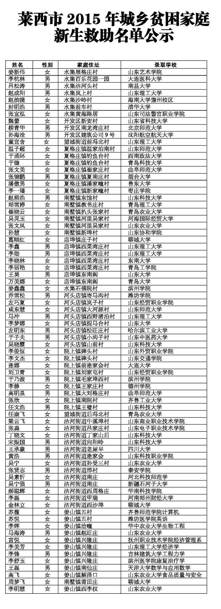 莱西市2015年城乡贫困家庭新生救助名单公示