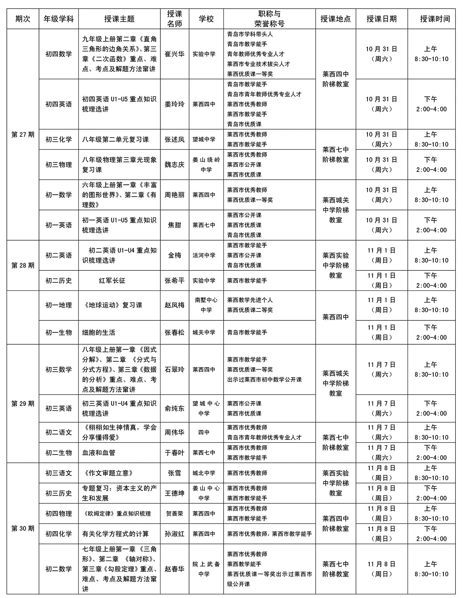 莱西市初中2015年秋季“青青义教——百位名师公益行”