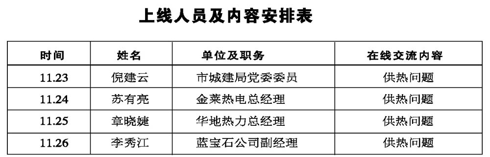 11月23日—11月26日供暖专题周,每天上午8:50—9:30,市城建局和供暖公司的领导做客莱西人民广播电台“政风行风在线”栏目,与听众进行在线交流,受理、答复群众投诉。 热线电话:66891007,节目参与短信平台:编辑数字1007+内容,移动用户发送至10628858,联通用户发送至06278787,欢迎广大听众积极参与。