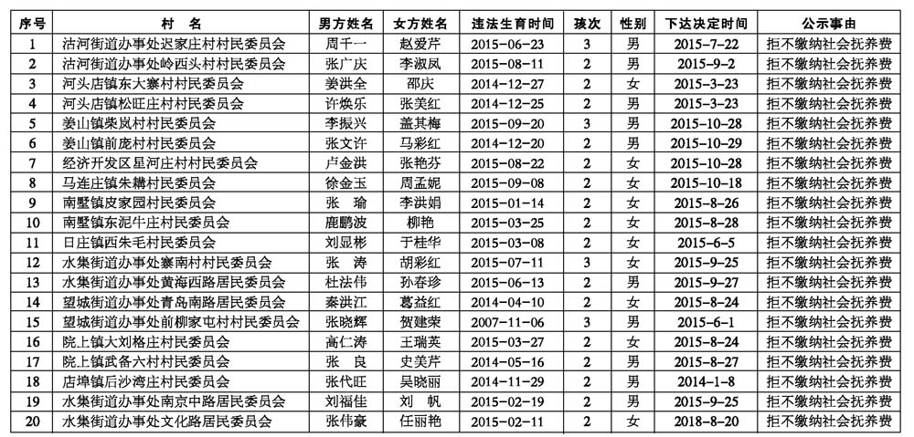 莱西市卫生和计划生育局关于部分违法生育人员情况的公示