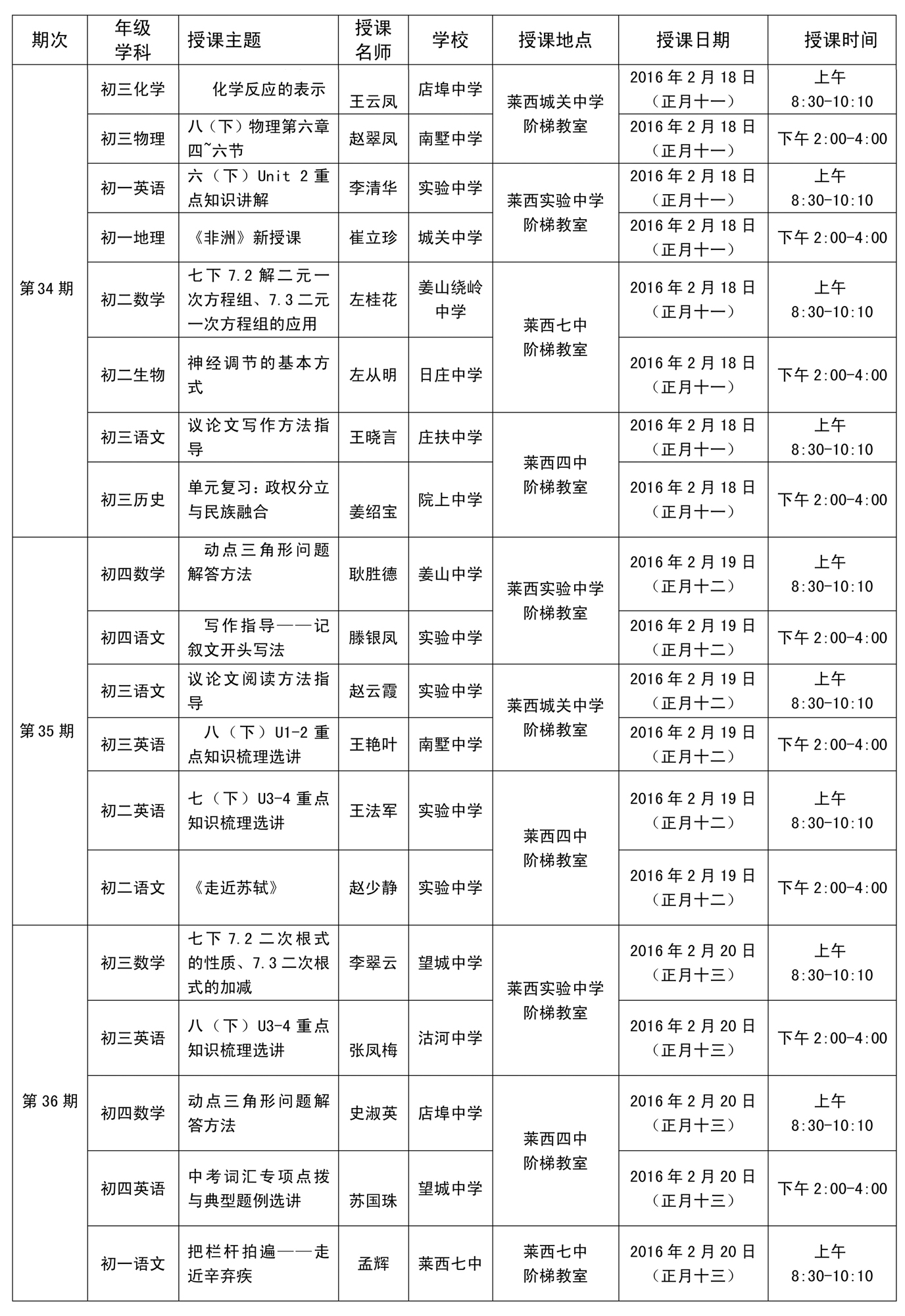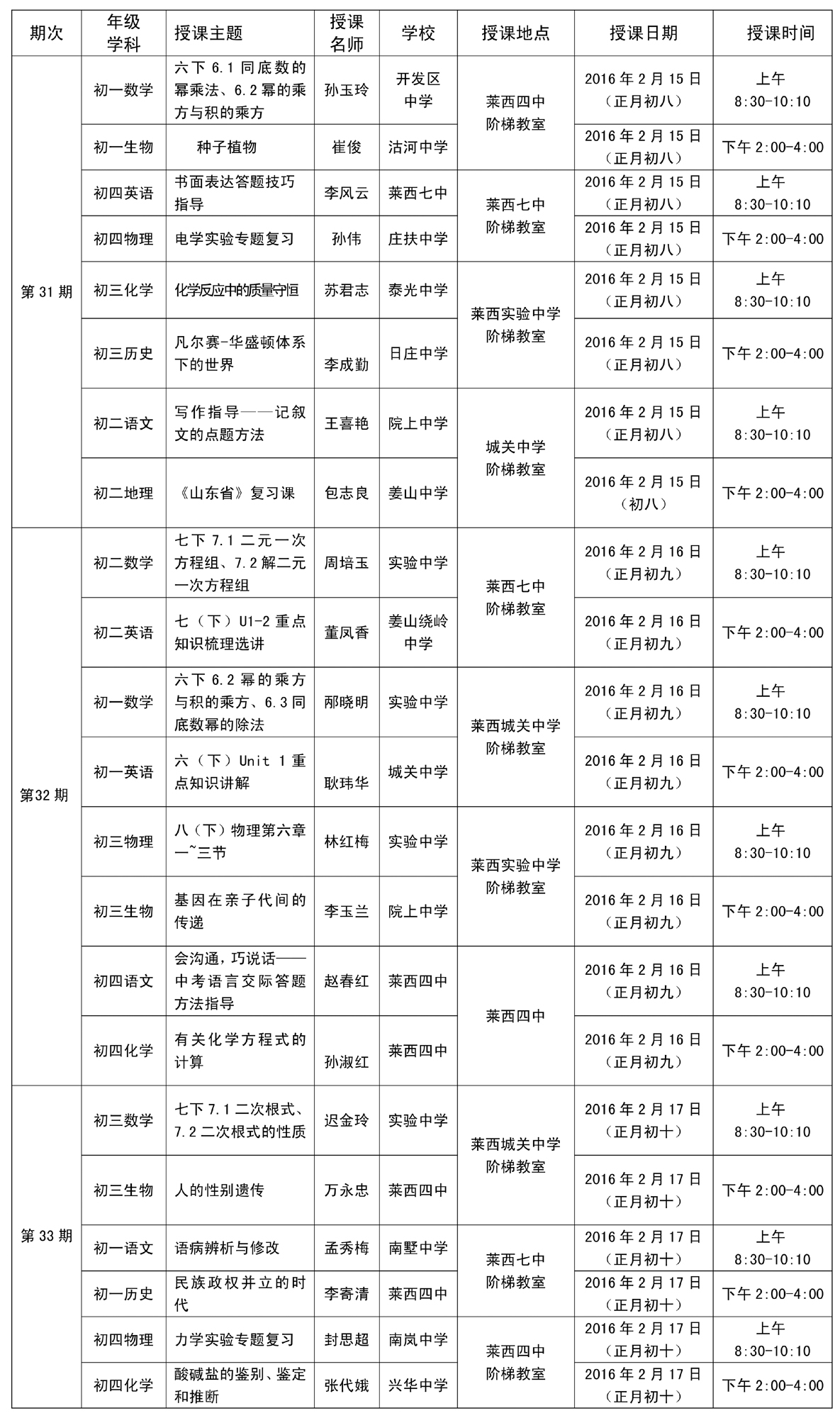 初中2016年寒假“青青义教——百位名师公益行”名师讲堂授课安排表