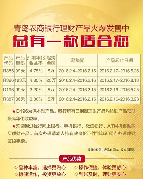 节前,青岛农商银行为投资者准备了一期诚意满满的春节理财产品。R386预期年化收益高达4.85%,是市场上同类产品中收益较高的一款。而对短期理财需求的投资者来说,青岛农商银行也准备了R385、r387两款预期年化收益率分别是4.75%和3.80%。此外,对求稳的投资者,还有保本型产品D196可供选择。