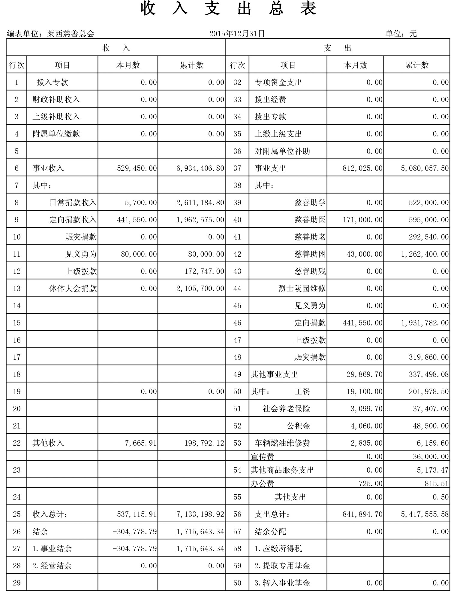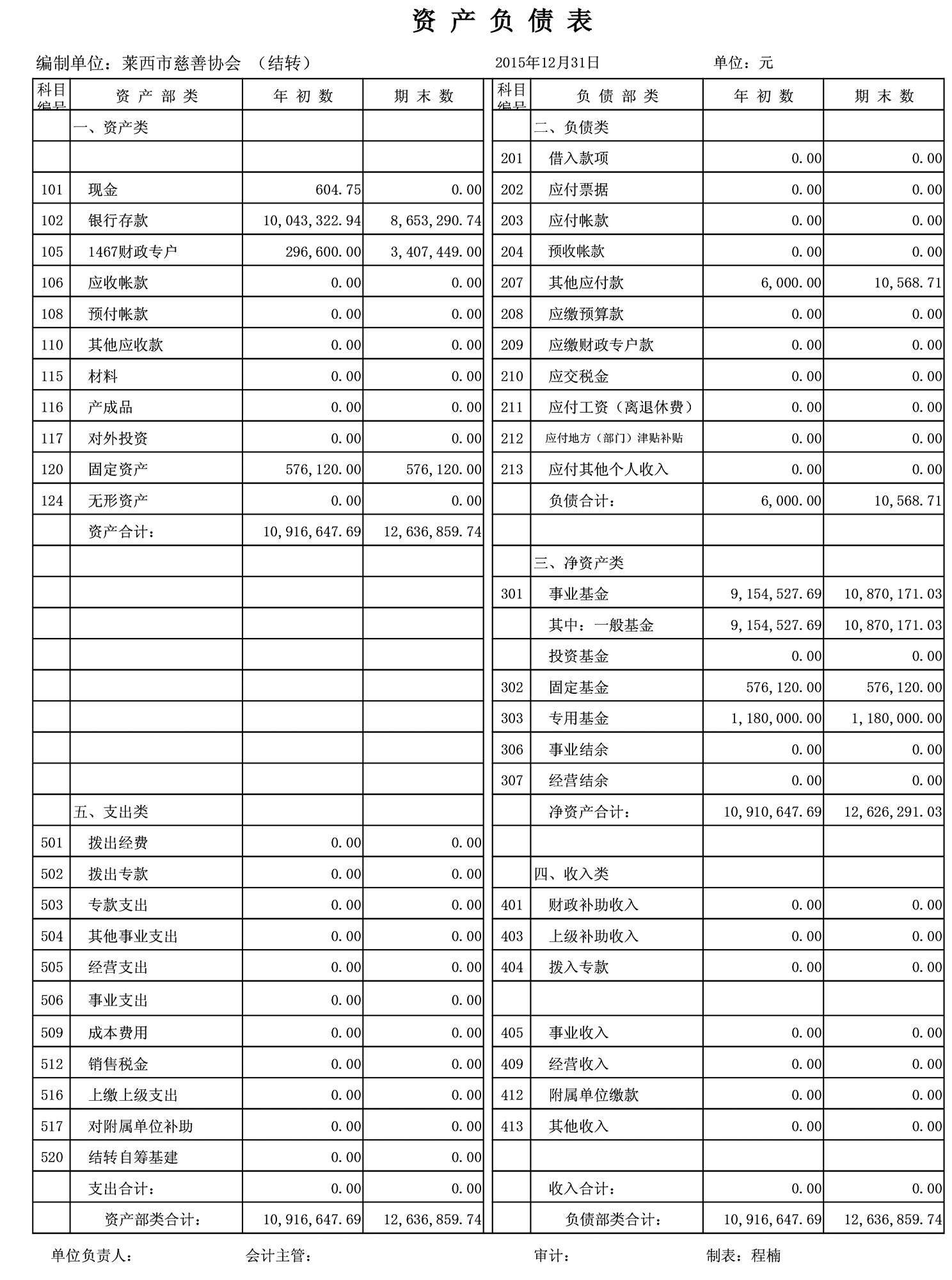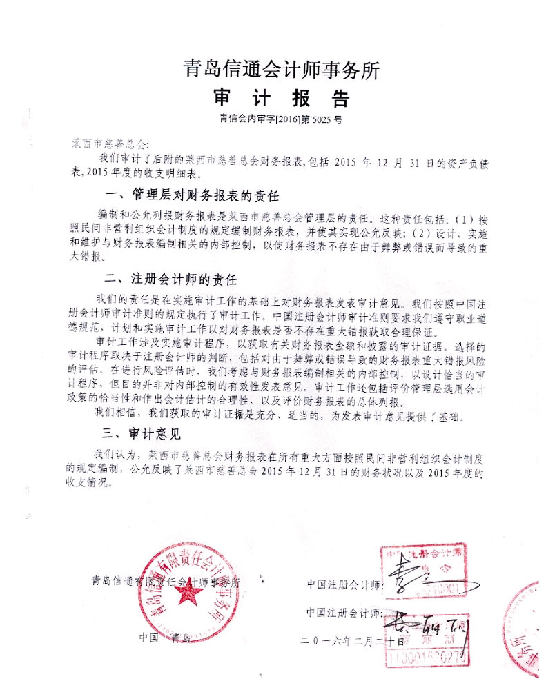 根据莱西市慈善总会章程规定,2015年度莱西市慈善总会财务报表已提请青岛信通会计师事务所进行了专题审计,现将审计情况予以公告。