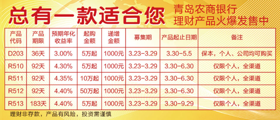 本期青岛农商银行理财产品可谓丰富多彩,根据不同类型投资者的需求,理财产品区分了5万元、10万元、50万元的起购门槛。
