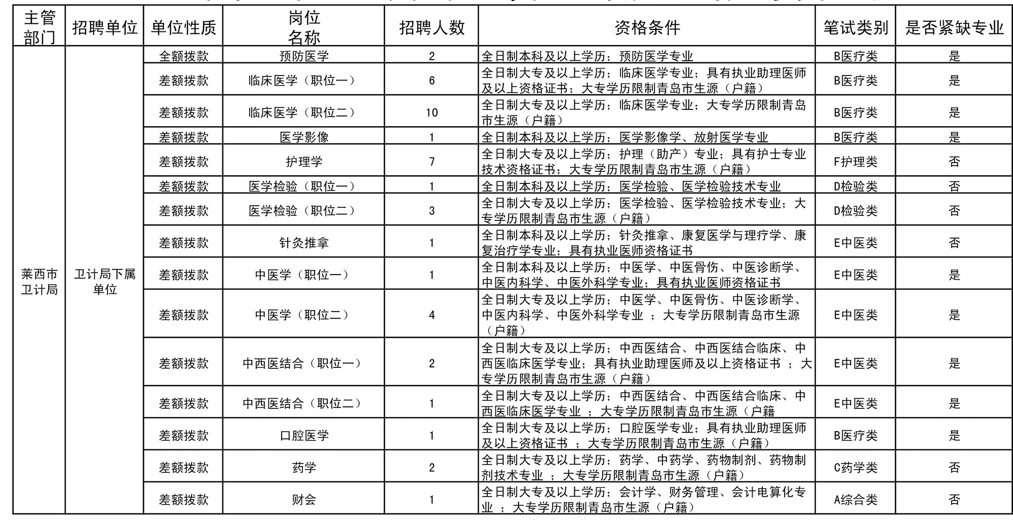 2016年莱西市卫生系统事业单位公开招聘工作人员计划表