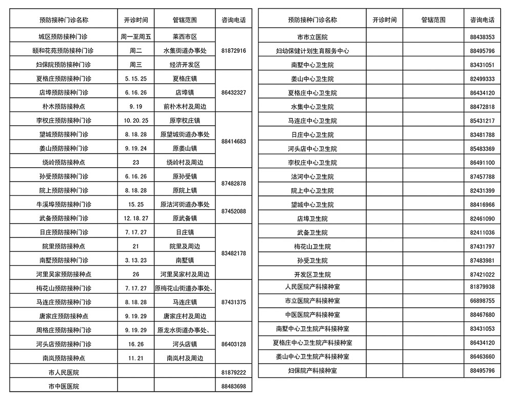 全市50处有接种资质单位名单及咨询电话