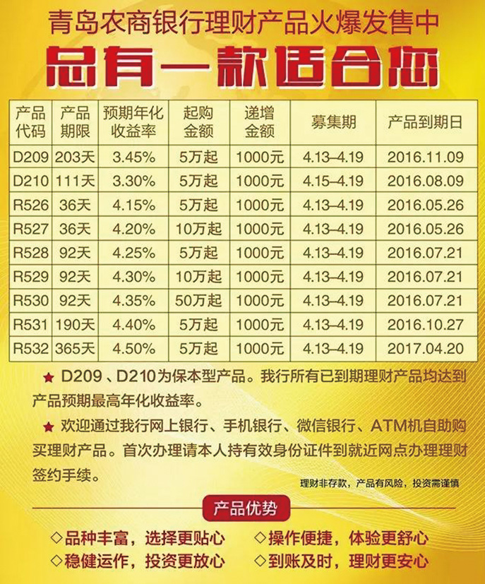 对有锁定中长期收益需求的投资者而言,青岛农商银行准备了R532产品,预期年化收益高达4.50%。