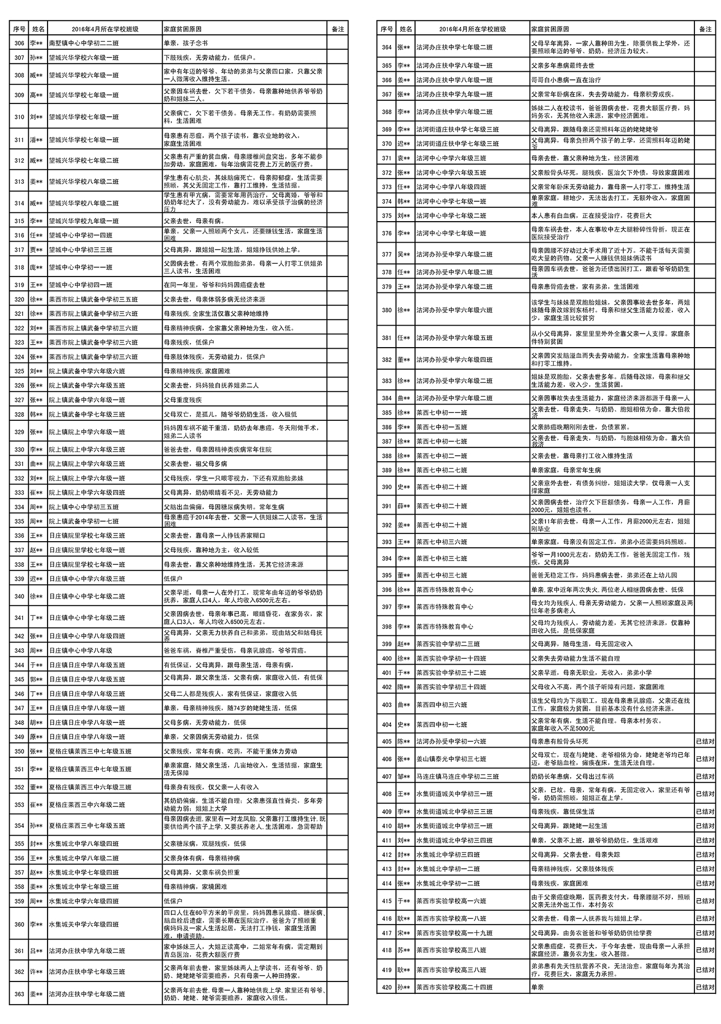 2016年莱西市需资助“春蕾女童”花名册
