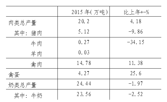 全市畜牧业增加值完成22.46亿元,比上年下降2.94%。大牲畜年末存栏9.63万头,比年初下降4.27%,其中奶牛7.8万头,比年初下降2.5%;生猪年末存栏41.24万头,比年初下降6.7%;家禽出栏9200万只,比上年增长11.23%。肉类总产量20.2万吨,比上年增长4.18%。禽蛋总产量4.27万吨,比上年增长25.6%。奶类总产量24.44万吨,比上年下降1.97%。