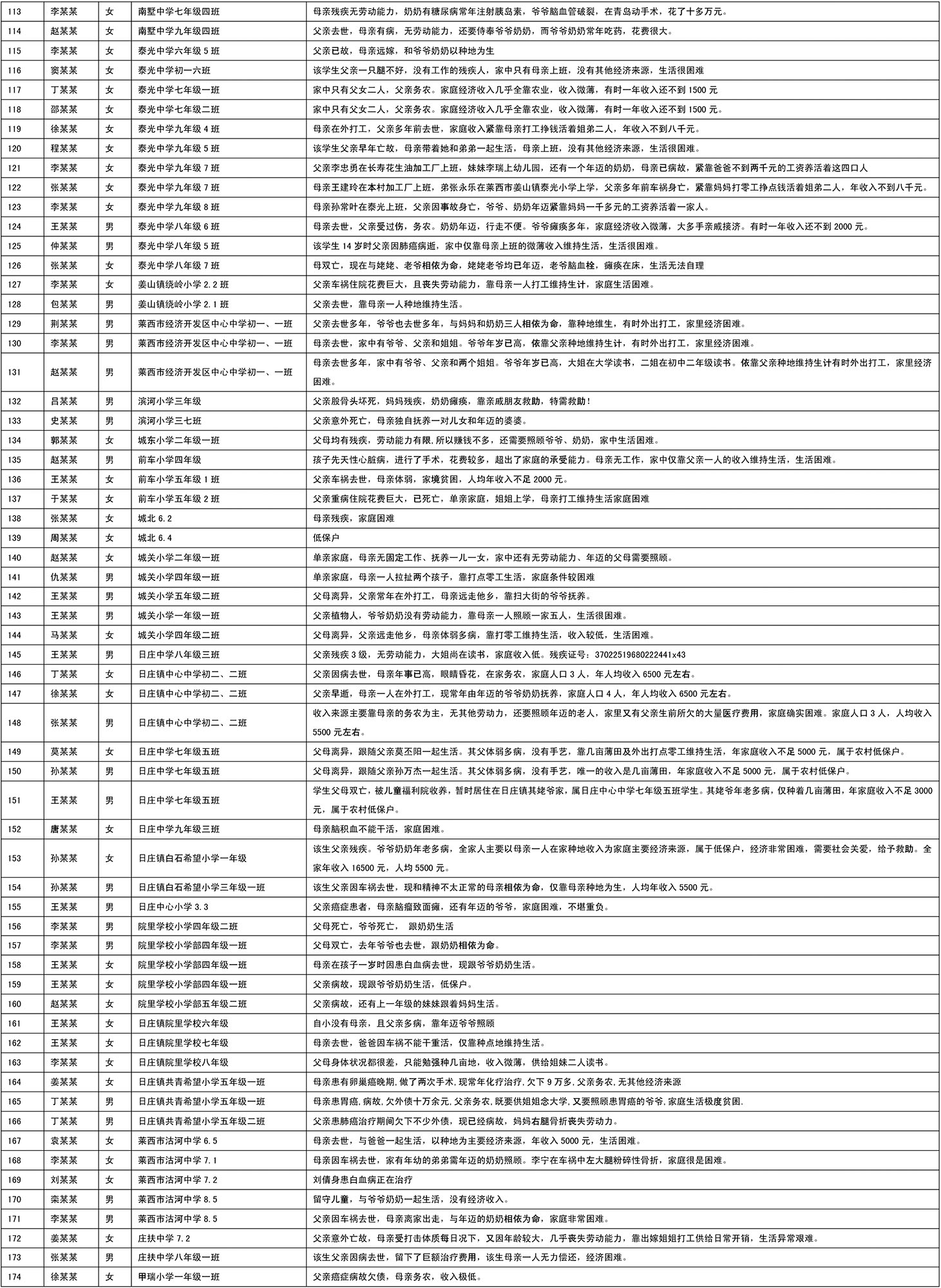 莱西市2016年度爱心助学部分帮扶对象名单