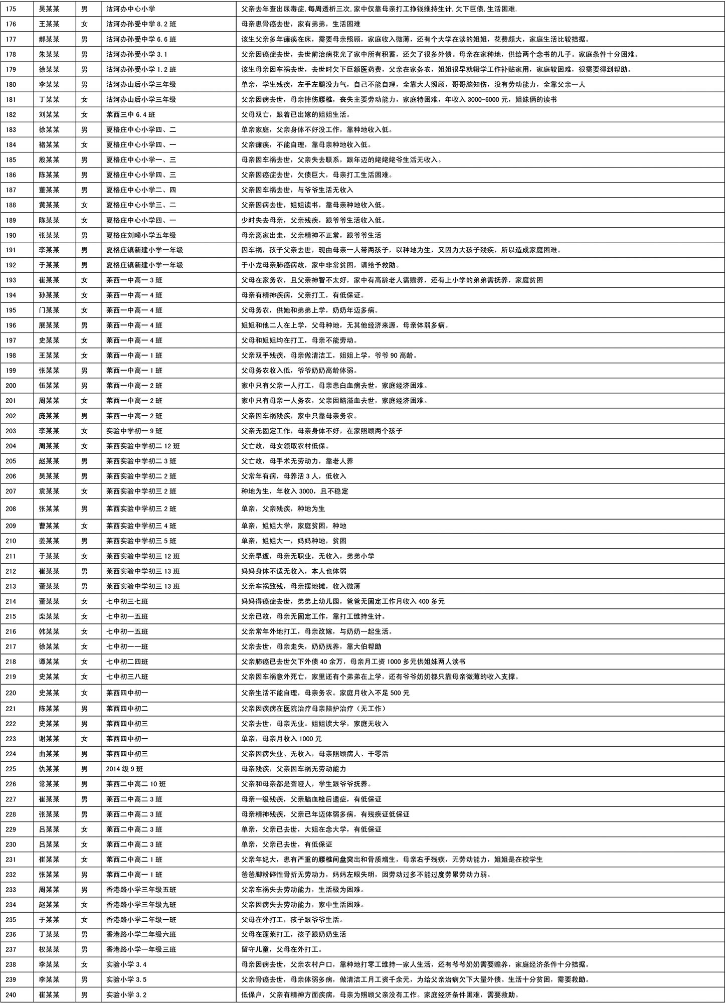 莱西市2016年度爱心助学部分帮扶对象名单