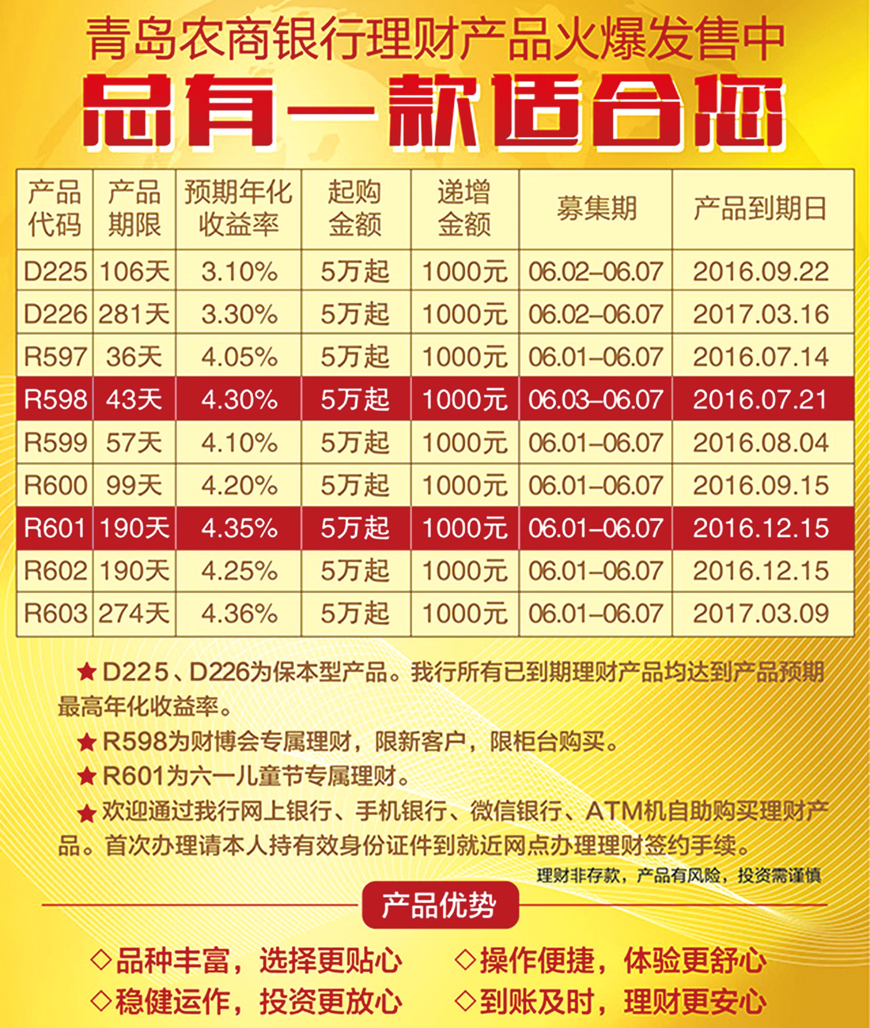 六一儿童节专属理财(R601) 产品期限:190天 预期年化收益:4.35% 起购金额:5万元 递增金额:1000元 募集期:6月1日至6月7日 没有什么比送孩子一座会增值的“小金库”当礼物更好的了!快提前为你家宝贝准备好“教育基金”吧! 欢迎通过青岛农商银行网上银行、手机银行、微信银行、ATM自助购买理财产品! 详询96668或青岛农商银行莱西支行各网点。