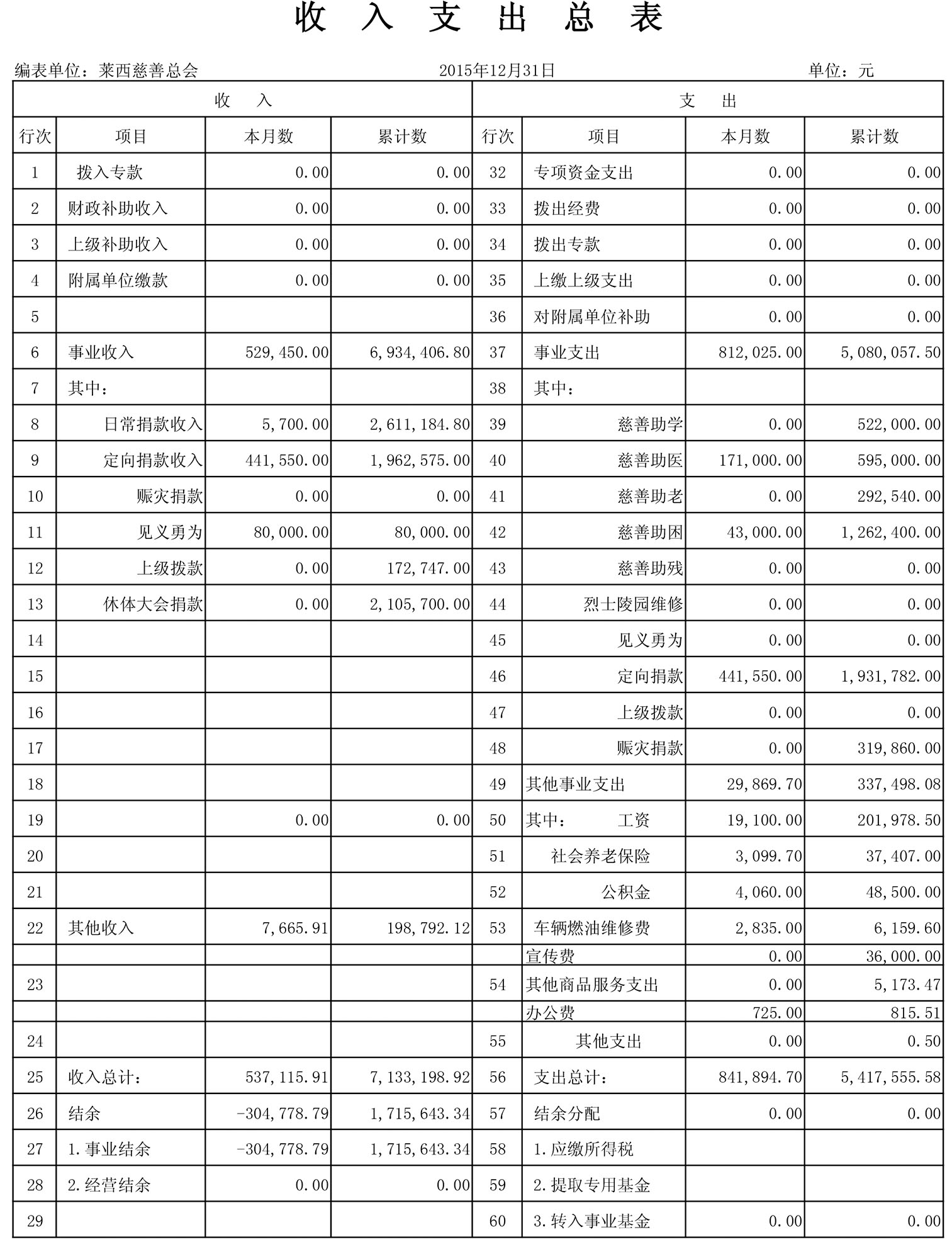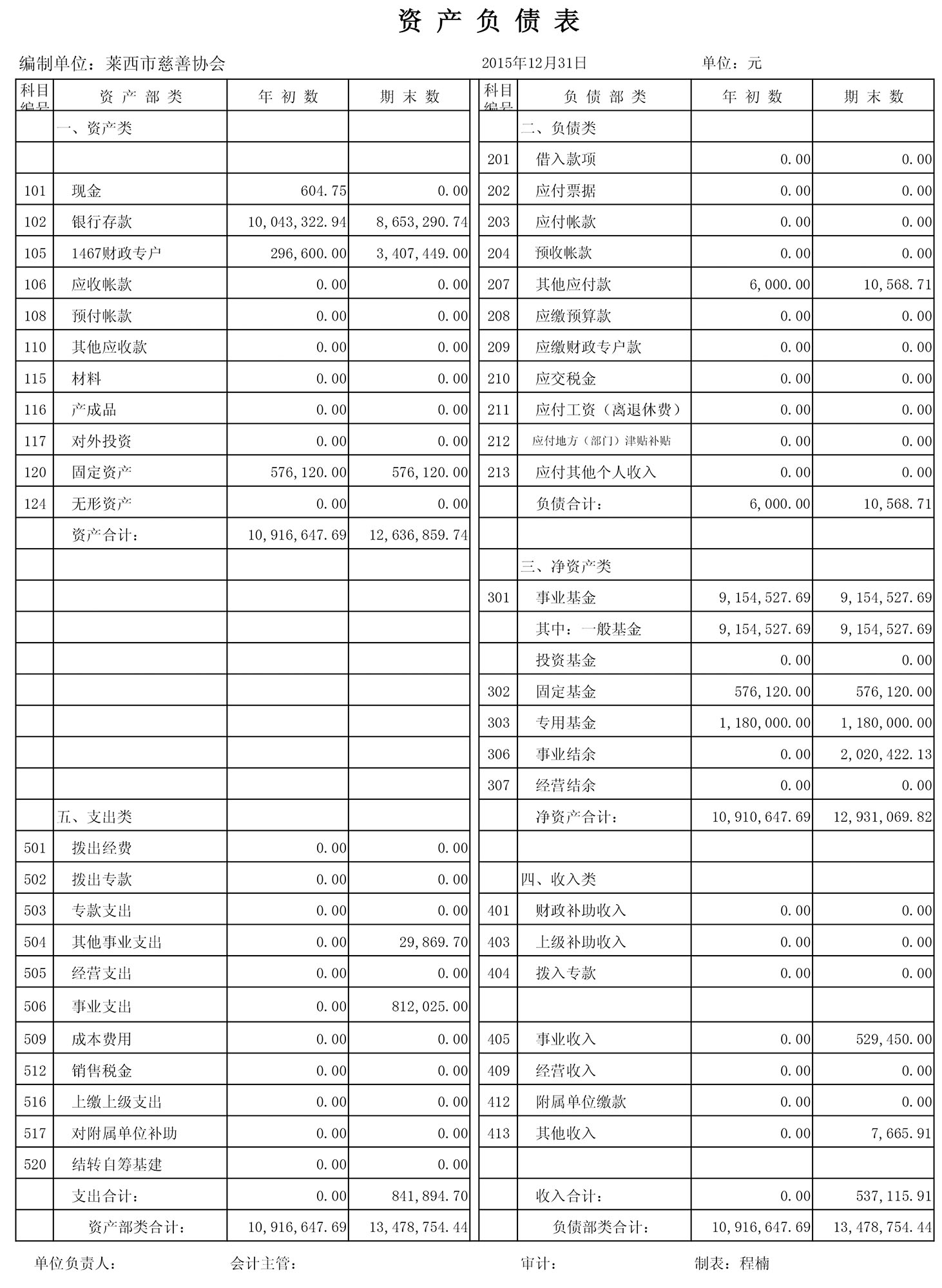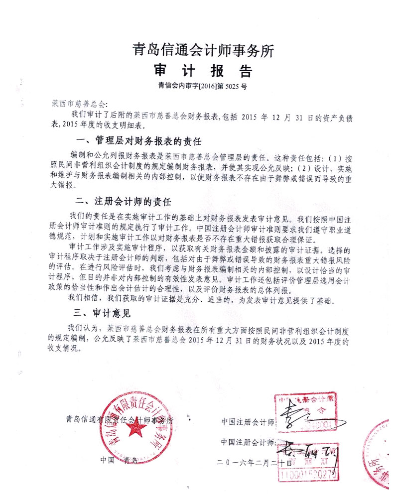 根据莱西市慈善总会章程规定,2015年度莱西市慈善总会财务报表已提请青岛信通会计师事务所进行了专题审计,现将审计情况予以公告。