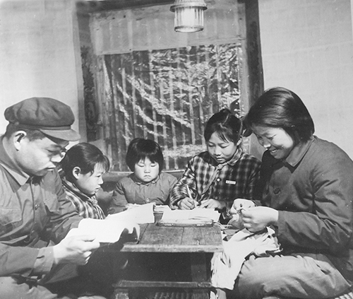 赵美立一家晚上在沼气灯下学习和做针线。