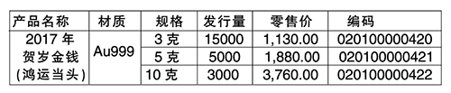 贺岁金钱,将传统贺岁文化和古代方孔圆钱的形式相结合,体现了丰富多彩的中国民俗文化。“鸿运当头”是传统的贺岁吉语,正面为昂首阔步的雄鸡,脚踩大石和花草,鸡冠饱满而茁壮。背面为贴合正面图案的“鸿运当头”主题文字,有吉祥卷草、花纹呈环形围绕四周。寓意为人们带来一年的鸿运。