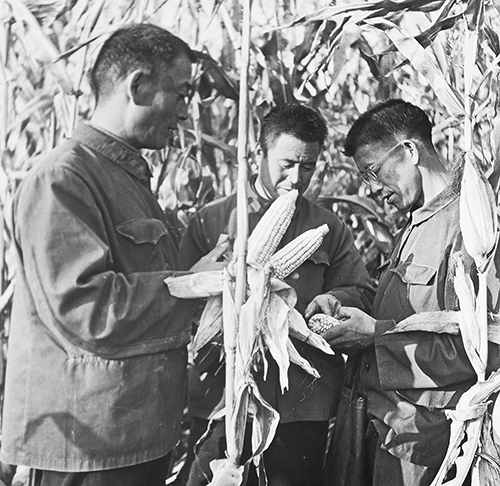 技术人员在田间查看玉米长势。