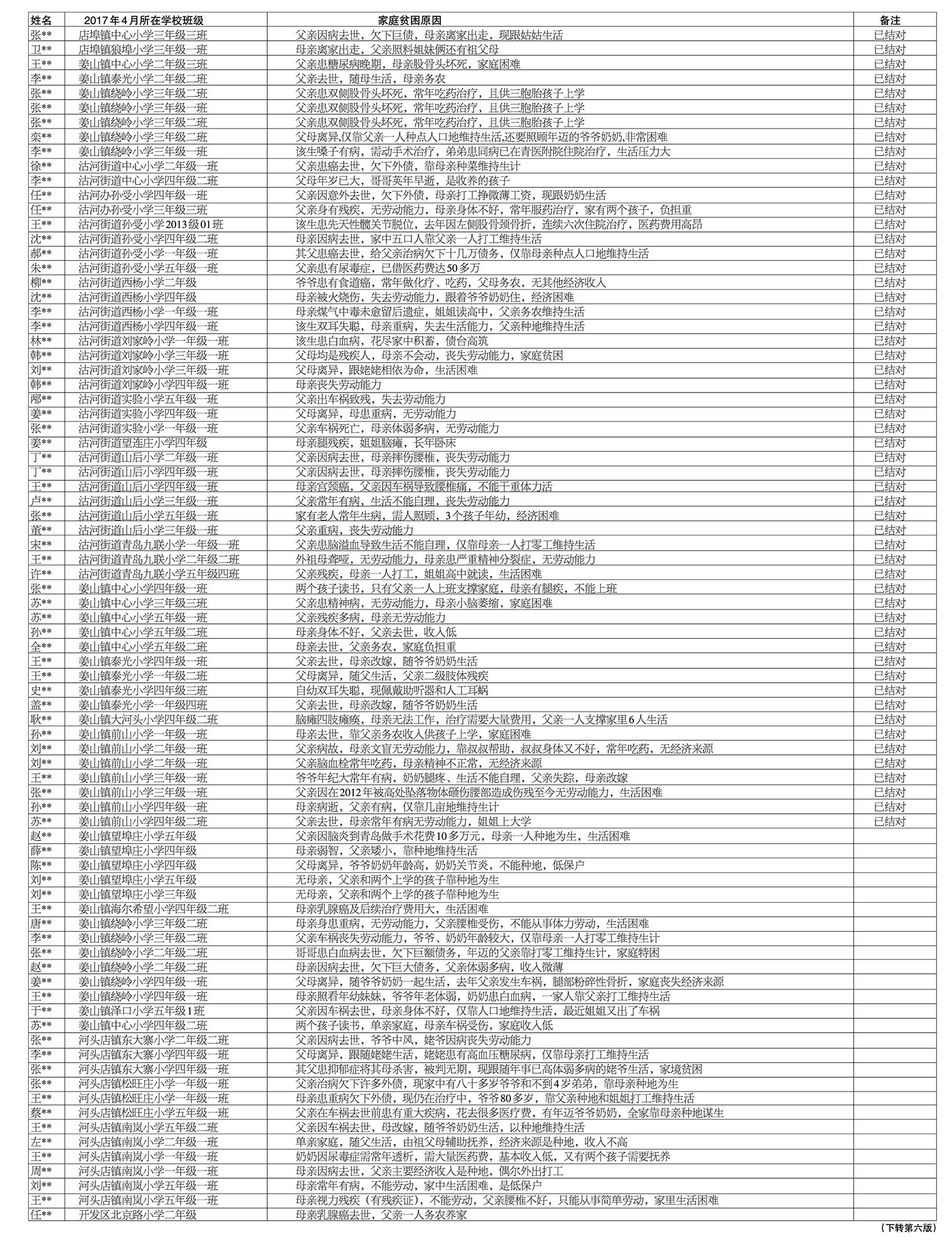 2017年莱西市需资助“春蕾女童”花名册(小学)