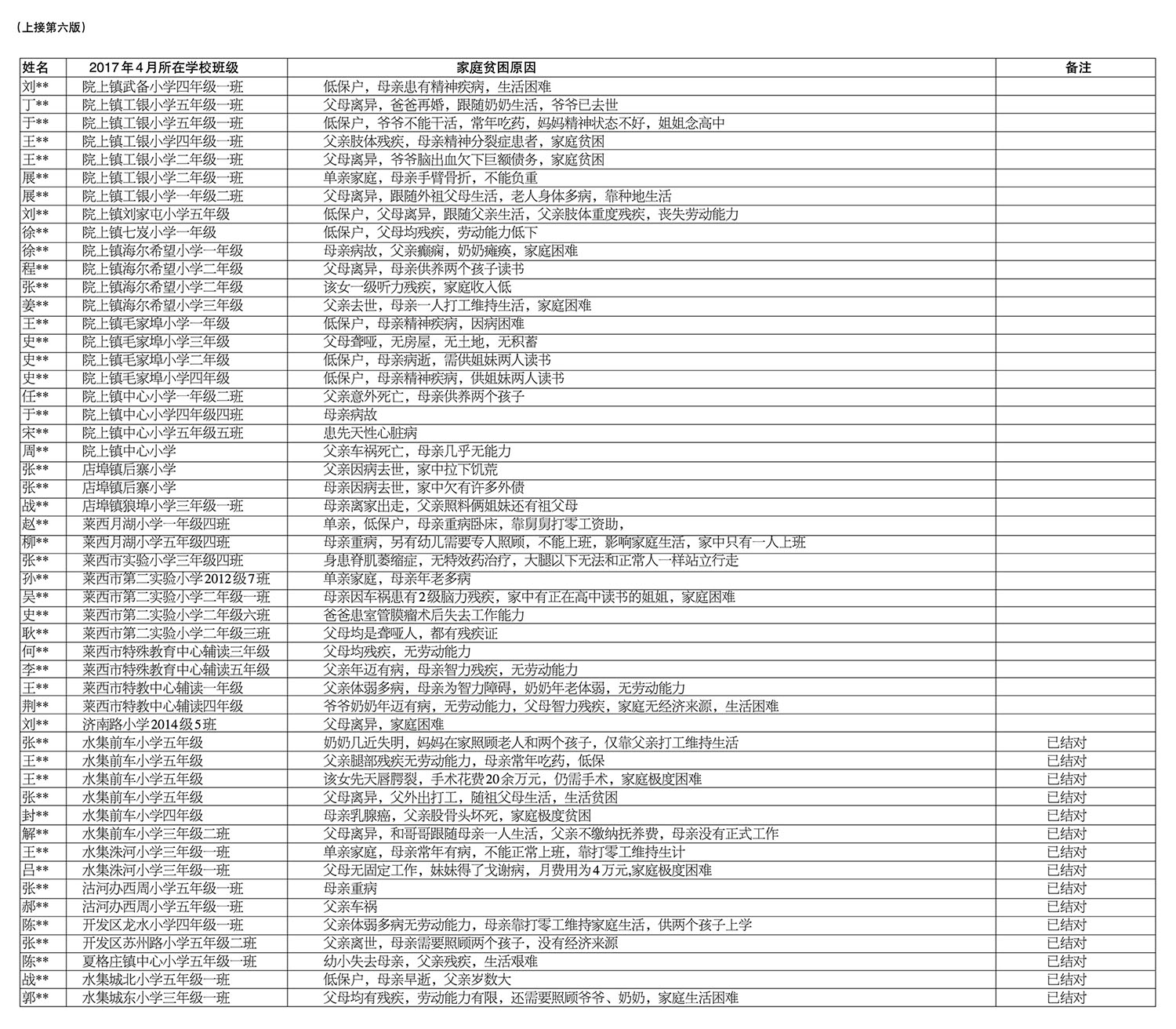 2017年莱西市需资助“春蕾女童”花名册(小学)
