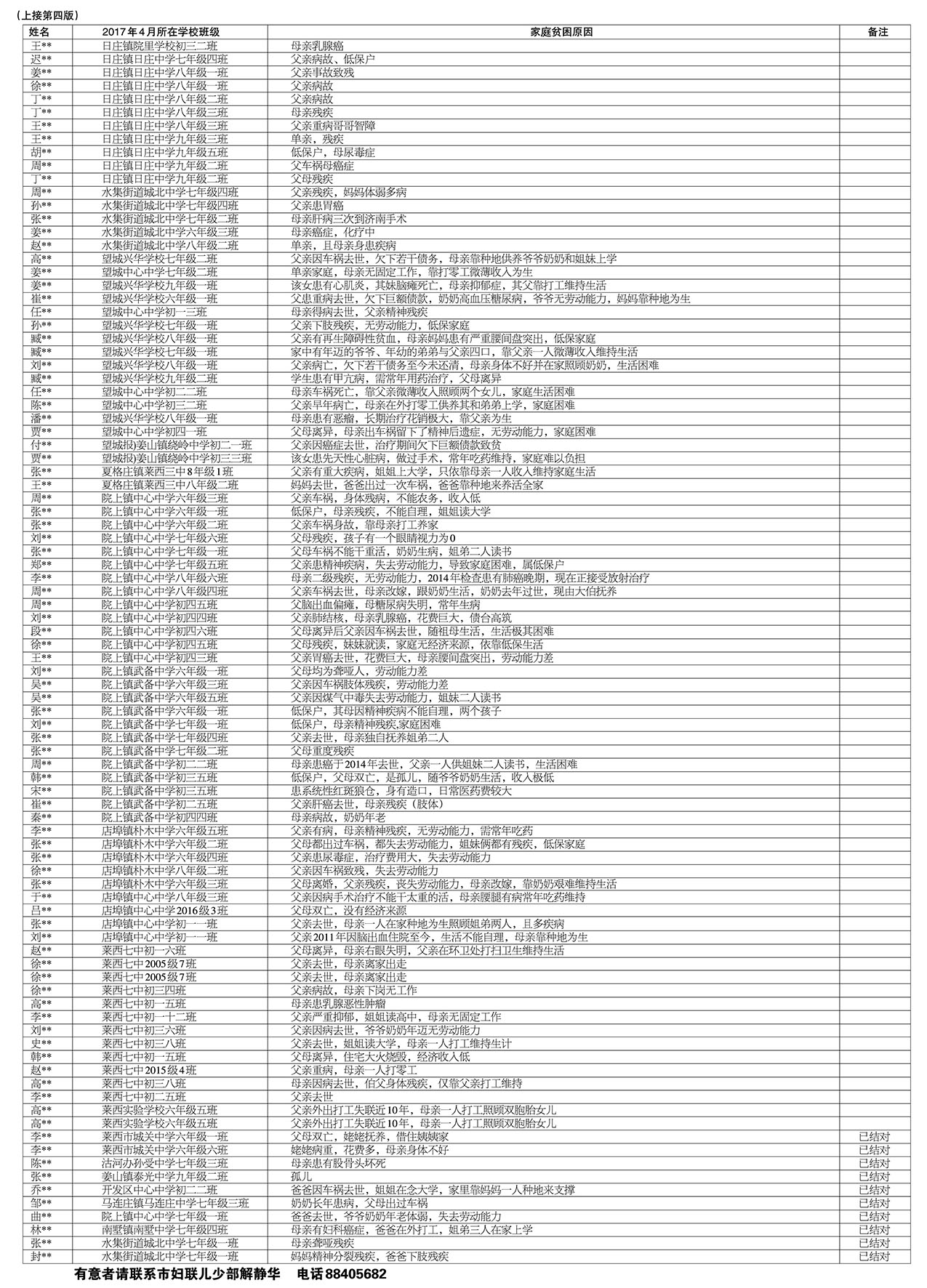 2017年莱西市需资助“春蕾女童”花名册(初中)