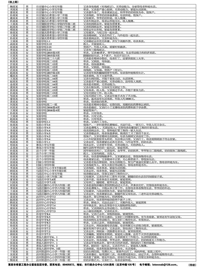 莱西市2017年度爱心助学部分帮扶对象名单
