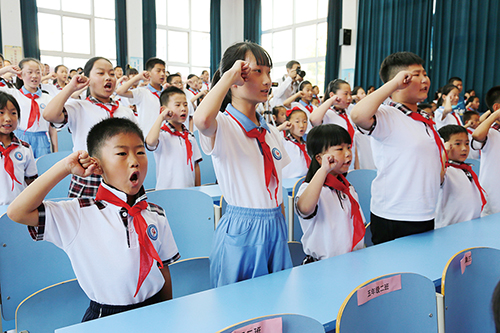 佩戴上鲜艳的红领巾是每一位新入学小学生的最大愿望。5月27日,香港路小学举行了新少先队员入队仪式。一年级新生举起右拳大声宣誓,光荣地加入了少先队组织,佩戴上鲜艳的红领巾后,他们脸上洋溢着自豪的笑容。