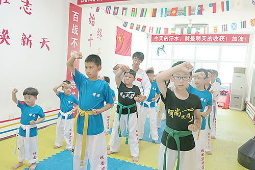 “背挺直,底气要足,出拳要快……”在位于青岛路职教中心路西的明尚空手道教育俱乐部,孩子们正在教练的指导下练习空手道基本动作。 徐亚晓 摄