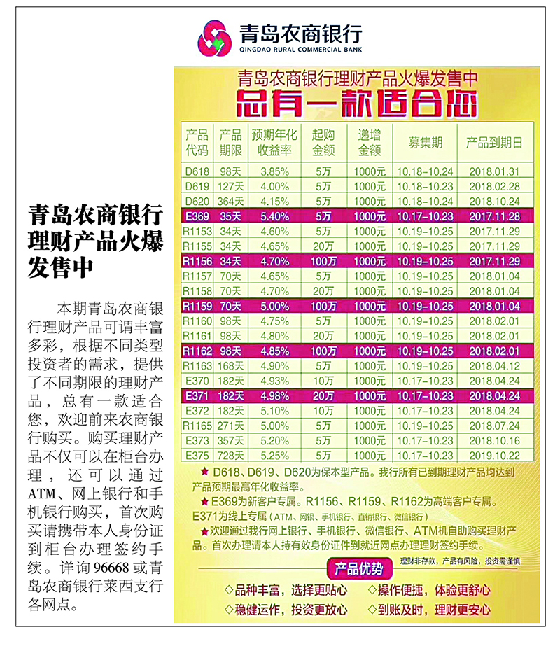 青岛农商银行理财产品火爆发售中
