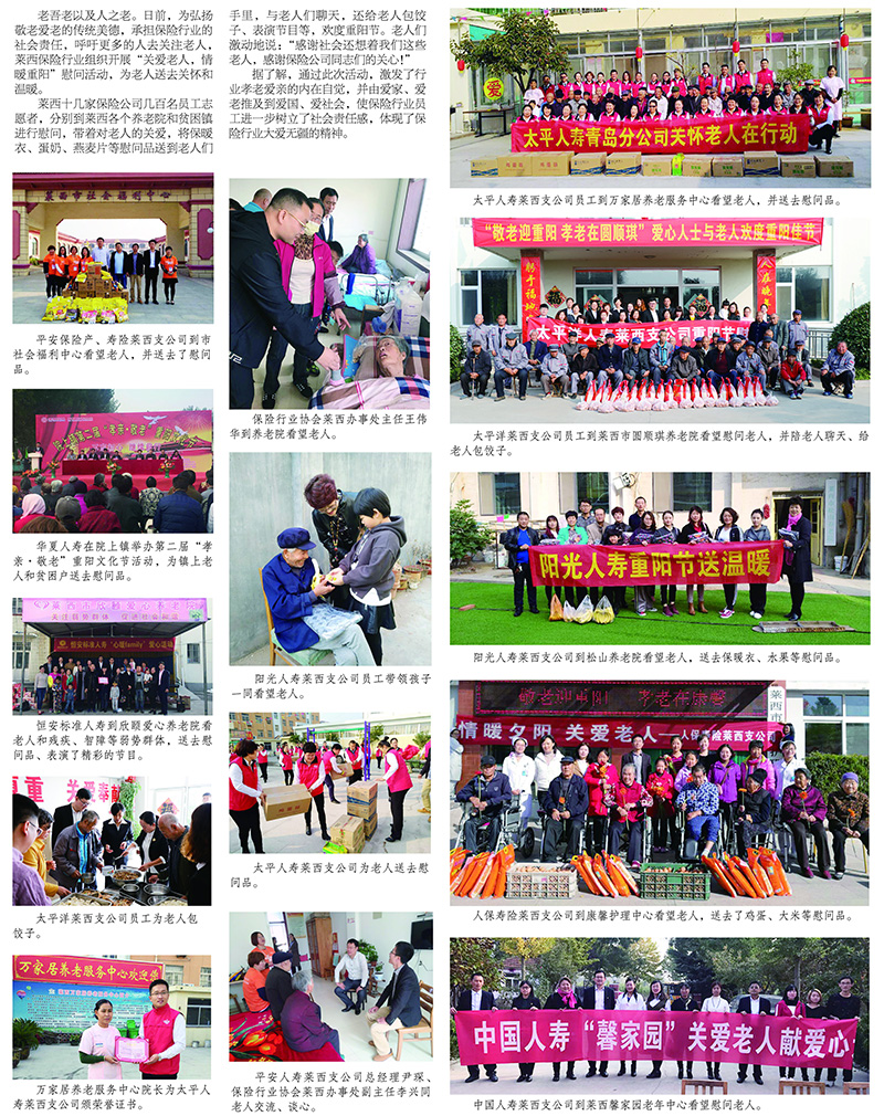 莱西十几家保险公司几百名员工志愿者,分别到莱西各个养老院和贫困镇进行慰问,带着对老人的关爱,将保暖衣、蛋奶、燕麦片等慰问品送到老人们手里,与老人们聊天,还给老人包饺子、表演节目等,欢度重阳节。老人们激动地说:“感谢社会还想着我们这些老人,感谢保险公司同志们的关心!”