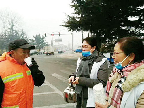日前,我市爱心家园志愿者团队的老师们,为市区的环卫工人、交通警察、小区门卫送去爱心姜汤,让那些在寒冷冬日仍坚持在室外工作的人们感受到社会的温暖。 (王玉翠)