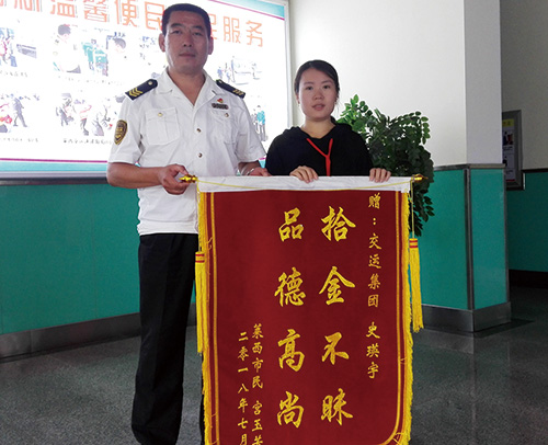 7月23日,交运莱西事业部总部收到市民宫玉芳送来的一面写有“拾金不昧,品德高尚”的锦旗,感谢公司员工史瑛宇拾金不昧。