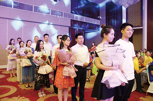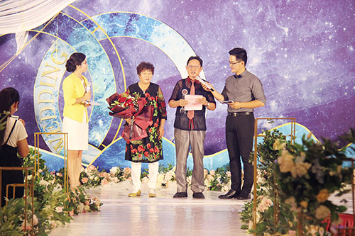 子女们登台献花,感谢父母养育之恩、教诲之情。