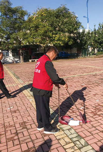 水集街道月湖街社区老人们穿上志愿者服装,参与到小广场卫生打扫中,为美化社区环境贡献余热。(谭洪云)