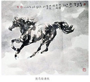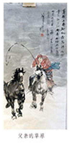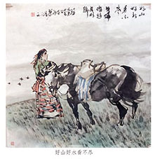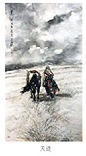 他善于用墨色刻画西部山水,亦善用墨画肖像。倪林海有学院派艺术家的深厚功底,更有坚实素描基础,画人物先用墨笔勾形,虽是写意笔法,人物形态却极其准确,高原人物形象,让人一看便有“青海风”,独具高原意味。在形态勾画的基础上,依形施以墨意,融西洋肖像画的明暗投影技法,将人物脸部的骨形肌态做入骨入肉的表现,以墨成像,栩栩如生。
