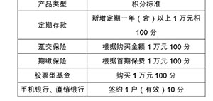 1.2019年1月1日至2019年4月10日,凡在该行办理业务的客户,均可按照积分标准进行积分,客户可以使用积分参与该行积分兑礼品活动。积分标准如下:
