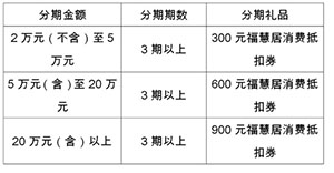 凡活动期间,持公务卡消费并办理分期3期(含)以上,分期合计金额满2万元以上的前200名客户可获赠相应分期金额礼品。
