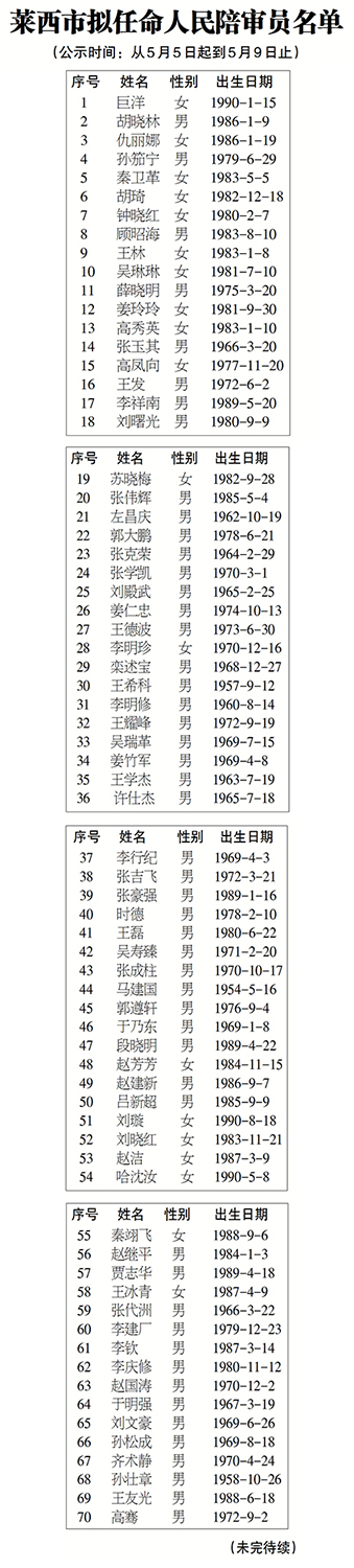 根据《中华人民共和国人民陪审员法》和《人民陪审员选任办法》等相关规定,莱西市司法局会同莱西市人民法院、莱西市公安局严格按照程序开展了我市人民陪审员选任工作。经过发布选任公告、建立候选人库、进行资格审查、随机抽选拟任命人选等环节,最终确定了129名人员作为莱西市人民法院人民陪审员拟任人选,该人选共分两批公示,现予以公示第一批人选,人员排序由司法部人民陪审员选任系统确定。