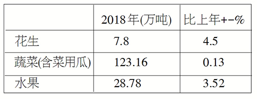 粮食播种面积130.86万亩,总产量达到55.89万吨,亩产达到427.07公斤;其中,夏粮(小麦)播种面积62.07万亩,总产量达到23.91万吨,亩产达到385.3公斤。全市花生总产量达到 7.8万吨,比上年增长4.5%,亩产达到 319公斤,蔬菜(含菜用瓜)总产量 123.16万吨,比上年增长0.13 %。