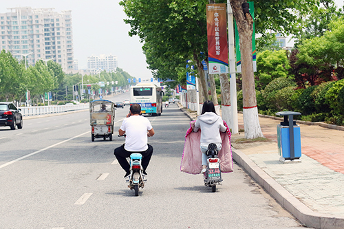 烟台路上,骑车打电话和不带头盔的不文明行为。
