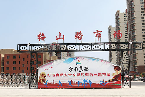 梅山路市场概况:梅山路市场是政府基础设施重点工程,位于翡翠城小区东侧,梅山路以南,占地面积30多亩,总投资1000余万元,建有90多间网点房,设400多节柜台,划分干鲜果、蔬菜、粮油副食品、水产、肉类等经营区。另外,市场内还配套保洁、保安力量,并安装30多个监控摄像头,按时开市、闭市,夜间实行封闭式管理。