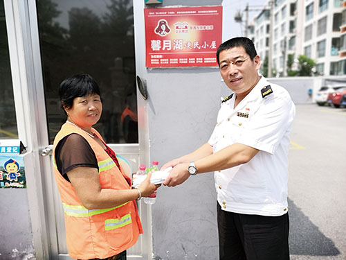 ▲日前,清理上海中路周边卫生的环卫工顼秀云刚扫完卫生区,交运莱西事业部工作人员就送上了一份“清凉大礼包”。 (崔克臣)