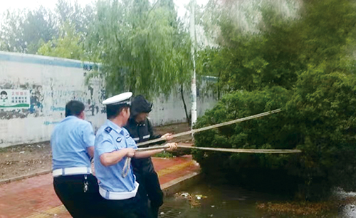 8月11日下午,莱西交警大队望城中队巡逻交警在辖区抗台风巡逻过程中发现辖区道路上有树木刮倒,为了不影响交通安全与秩序,望城中队巡逻交警将倒塌树木搬至路边。为了应对利奇马,莱西交警大队全体警力24小时备勤,工作在抗台第一线。共出动警力800余人次,警车40台,在辖区内进行交通巡逻疏导,巡查隐患情况。 (封志远)