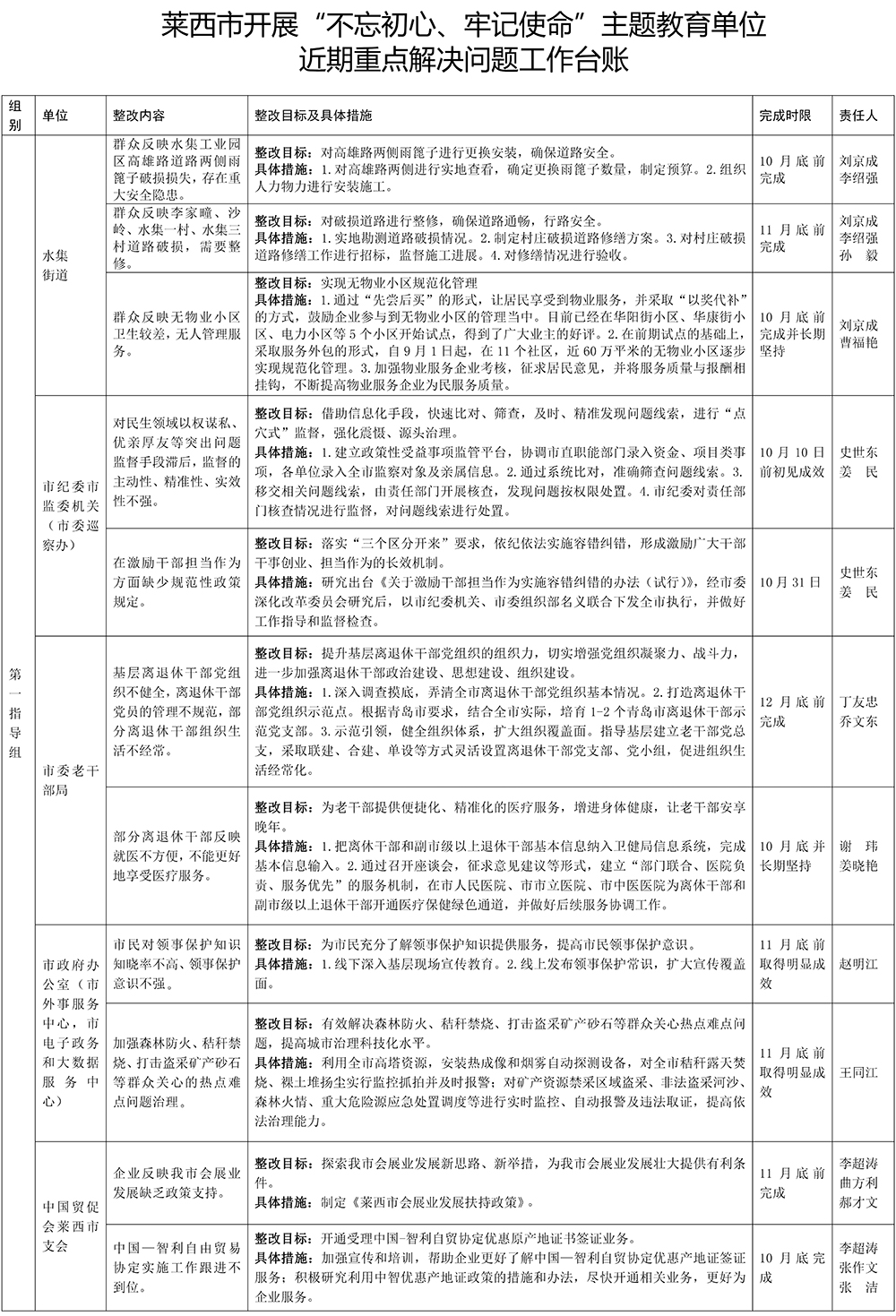 莱西市开展“不忘初心、牢记使命”主题教育单位近期重点解决问题工作台账