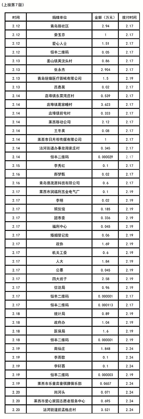 莱西市慈善总会新冠肺炎防治捐款统计台帐(拨付青岛统一汇武汉)